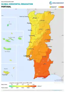 Le Portugal se classe au 9e rang des pays européens producteurs d'électricité éolienne en 2022 ; pour la puissance installée éolienne par habitant il est au 7e rang européen. Sa production solaire atteignait 4,3 % de la production d'électricité du pays en 2021, et en 2022 elle progresse de 55 %, se classant au 11e rang des producteurs photovoltaïques de l'Union européenne. La puissance installée des centrales hydroélectriques portugaises se classe au 10e rang européen ; 45,5 % de cette puissance se compose de centrales de pompage-turbinage.
