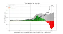En 2022, la production de charbon du Vietnam était de 49,8 Mt (1,17 EJ), soit 0,7 % du total mondial ; elle a progressé de 3,2 % en 2022 et de 18 % entre 2012 et 2022[e 1]. La consommation de charbon a été de 2,05 EJ, en baisse de 5 % en 2022 et de 206 % de 2012 à 2022 ; la production nationale couvre seulement 57 % de la consommation[e 2] et le pays importait 0,75 EJ en 2021[1].