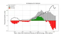 Le Vietnam est exportateur net de pétrole brut, mais importateur net de produits pétroliers ; la consommation de ces produits a progressé de plus de 70 % entre 2004 (238 400 barils par jour) et 2013 (413 000 barils par jour), si bien que le pays doit importer la majorité de ses besoins[4].