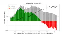 La production de pétrole brut de l'Indonésie décline peu à peu : de 3 123 PJ en 1990 à 1 408 PJ en 2021, soit une baisse de 55 % en 31 ans[1].
