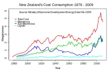 En 2021, la Nouvelle-Zélande a importé 42,8 PJ de charbon et en a exporté 35,4 PJ ; le solde importateur net de 7,4 PJ représente 8,5 % de la consommation nationale. En 2020, les centrales électriques ont consommé 25 % de l'approvisionnement net, les centrales à cycle combiné 11 % et l'industrie 33 %[1].