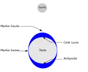 La surface des océans, en raison du gradient d'attraction lunaire entre le côté faisant face à la Lune et le côté opposé, adopte en moyenne, en coupe, une forme elliptique, dont le grand axe est orienté sur la direction Terre-Lune. La Terre tournant sur elle-même en 24 heures (approximativement) alors que la Lune tourne autour de la Terre en 28 jours (approximativement), le mouvement de rotation de la Terre par rapport à l'axe Terre-Lune produit le phénomène des marées.