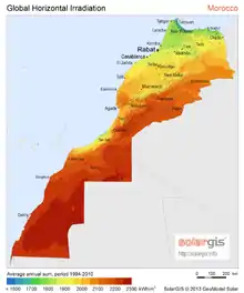 Le potentiel solaire du Maroc est exceptionnel, avec des valeurs d'irradiation annuelle supérieures à 2 200 kWh/m2 dans les régions méridionales, en particulier au Sahara occidental.