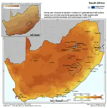 La carte ci-contre montre que le potentiel solaire de l'Afrique du Sud est particulièrement élevé : la majeure partie du territoire dépasse 2 400 kWh/m², et de vastes régions au centre et au nord atteignent des ensoleillements supérieurs à 2 500 kWh/m², niveau qui ne se retrouvent que dans les parties les plus ensoleillées du Sahara, de l'Arabie et du nord du Chili ; la totalité de l'Afrique du Sud dépasse le niveau de 1 600 kWh/m² qui est celui de la Provence.