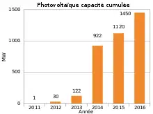 La filière photovoltaïque fournissait 2 % de la production nationale d'électricité en 2021 ; sa progression a été très rapide de 2014 à 2017, puis en 2020 et 2021 après deux années de répit ; la mise en service en 2013 et 2014 des premières centrales solaires de grande taille a augmenté fortement la production ; la puissance installée est passée de 41 MWc fin 2012 à 4 172 MWc fin 2020 ; en comparaison, celle de la France est de 10 920 MWc.
