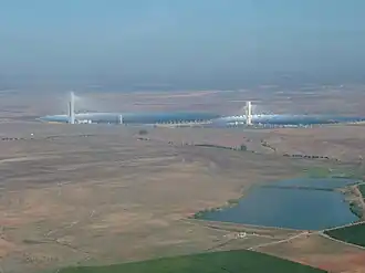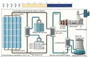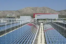 • Torresol Energy Investments, créée en 2007 par SENER[77] (groupe privé espagnol d'ingénierie et de technologie - 60 %) et Masdar (compagnie d'énergies renouvelables du gouvernement d'Abu Dhabi - 40 %) : (Tour solaire Solar Tres (appelée aussi Gemasolar): 19,9 MW, inaugurée en mai 2011 dans la province de Séville, avec un système de stockage thermique de sels fondus à grande capacité d'absorption calorifique, qui permet de produire de l'électricité pendant 15 heures en l'absence de soleil ; 2 centrales de 50 MW avec stockage thermique pour 7,5 heures de fonctionnement : Valle 1 et Valle 2 (San José del Valle, Cadix).