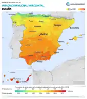 Alors que l'irradiation solaire annuelle globale horizontale (IGH) en France est en moyenne de 1 274 kWh/m² et celle de Provence-Alpes-Côte d'Azur de 1 645 kWh/m²[1], on peut constater sur la carte ci-contre que la majeure partie de l'Espagne dépasse largement 1 600 kWh/m² et que la partie sud (Andalousie) dépasse 1 900 kWh/m².
