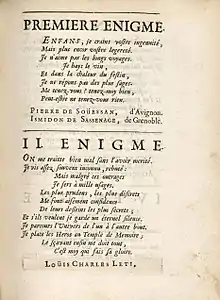 D'après le Dictionnaire de l'Académie française, une énigme est la « description, exposition d'une chose naturelle en termes qui la déguisent, et qui la rendent difficile à deviner. »[1]