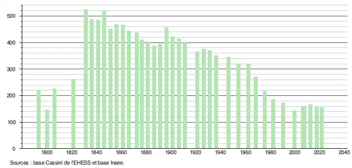 L'évolution du nombre d'habitants est connue à travers les recensements de la population effectués dans la commune depuis 1793. Pour les communes de moins de 10 000 habitants, une enquête de recensement portant sur toute la population est réalisée tous les cinq ans, les populations légales des années intermédiaires étant quant à elles estimées par interpolation ou extrapolation[24]. Pour la commune, le premier recensement exhaustif entrant dans le cadre du nouveau dispositif a été réalisé en 2007[25].