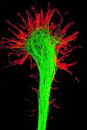 Au cours du développement du système nerveux central (ou neurodéveloppement), la signalisation d'Eph/éphrine joue un rôle essentiel dans la migration de cellule à cellule de plusieurs types d'axones neuronaux vers leurs organes cibles[20],[21]. La signalisation Eph/éphrine contrôle le guidage des axones neuronaux par leur capacité à inhiber la survie des cônes de croissance axonale, qui repousse l'axone migrant loin du site de l'activation Eph/éphrine[20]. Les cônes de croissance des axones migrateurs ne répondent pas simplement aux niveaux absolus d'Ephs ou d'éphrines dans les cellules qu'ils contactent, mais répondent aux niveaux relatifs de l'expression d'Eph et d'éphrine[22], ce qui permet aux axones migrateurs qui expriment les Ephs ou les éphrines d'être dirigés le long de gradients d'Eph ou d'éphrine exprimés par les cellules vers une destination où la survie axiale du cône de croissance n'est plus complètement inhibée[20].