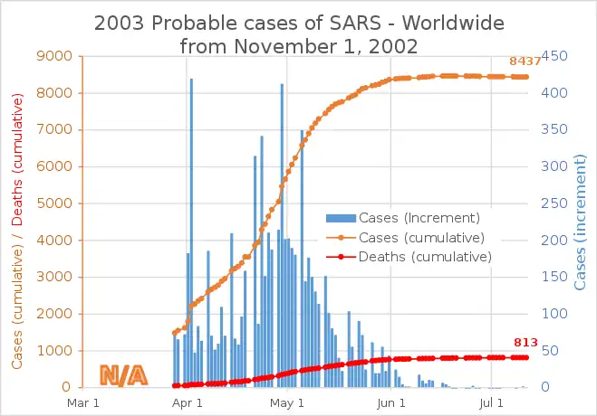 Reconnu comme assez contagieux (R0 ≈ 2–3, contre 12–18 pour la rougeole[3]), et fortement létal (9 % contre 63 % pour Ebola[4]), le virus SARS-CoV se répand à partir de . Parti de Chine, il parcourt rapidement le globe en suivant les axes du transport de voyageurs international et atteint 29 pays en quelques mois (cf. Tableau ci-dessous). L'évolution des contaminations est exponentielle jusqu'en (cf. graphique ci-dessous), puis se stabilise avant de chuter.