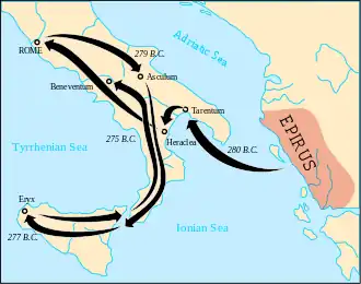 Pyrrhus, le fils d'Éacide, monte sur le trône en 295. Pyrrhus, étant un général habile, est encouragé à aider les Grecs de Tarente et lance une offensive majeure dans la péninsule italienne et en Sicile. En raison de ses capacités martiales supérieures, l’armée épirote bat les Romains lors de la bataille d'Héraclée (280). Par la suite, les forces de Pyrrhus atteignent presque la périphérie de Rome, mais dut battre en retraite afin d'éviter un affrontement inégal avec une armée romaine plus nombreuse. L'année suivante, Pyrrhus envahit les Pouilles (279) et affronte les romains lors de la bataille d'Asculum durant laquelle les Épirotes remportent la victoire éponyme à la Pyrrhus, au prix d'un lourd tribut[10]. En 277 av. J.-C., Pyrrhus s'empare de la forteresse carthaginoise du mont Éryx, en Sicile. Cela incite le reste des villes carthaginoises à se coaliser contre Pyrrhus. Pendant ce temps, il commence à adopter un comportement despotique envers les Grecs siciliens et bientôt l'opinion sicilienne se montre hostile envers lui. Bien qu'il ait vaincu les Carthaginois au combat, il fut contraint d'abandonner la Sicile[11]. La campagne italienne de Pyrrhus prend fin après la bataille de Bénéventum en 275. Ayant perdu la grande majorité de son armée, il décide de retourner en Épire, ce qui aboutit finalement à la perte de toutes ses possessions italiennes. En raison de ses victoires coûteuses, le terme « victoire à la Pyrrhus » est souvent utilisé pour désigner une victoire au coût dévastateur pour le vainqueur[12].