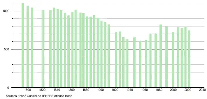 L'évolution du nombre d'habitants est connue à travers les recensements de la population effectués dans la commune depuis 1793. Pour les communes de moins de 10 000 habitants, une enquête de recensement portant sur toute la population est réalisée tous les cinq ans, les populations légales des années intermédiaires étant quant à elles estimées par interpolation ou extrapolation[16]. Pour la commune, le premier recensement exhaustif entrant dans le cadre du nouveau dispositif a été réalisé en 2006[17].