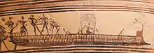 Quant à la guerre navale, elle semble rester peu importante durant la majeure partie de l'époque archaïque, bien que la piraterie semble courante. Thucydide décrit cependant la mise en place de la puissance navale de Corinthe dès la fin du VIIIe siècle, qui se traduit notamment par un conflit naval contre une de ses fondations, Corcyre. Les cités d'Ionie développent leurs flottes au VIe siècle, Polycrate de Samos constituant une puissance maritime qui lui permet d'affirmer sa suprématie sur un large territoire. Les cités rivales d'Égine et d'Athènes constituent également des flottes importantes à la fin de la période[141].