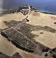 De nombreuses villes archaïques disposent de fortifications, au moins 43 % selon une estimation, probablement trop basse. Ces constructions sont difficiles à dater par l'archéologie, mais il est estimé qu'au VIe siècle elles sont courantes[98]. La place publique, l'agora, centrale dans la vie politique, économique et religieuse des cités, se développe progressivement durant l'époque archaïque. Les plus anciens exemples connus sont des esplanades entourées de gradins, à Dréros et Latô en Crète. Mégara Hyblaea présente dès la seconde moitié du VIIe siècle une agora planifiée et monumentalisée, avec des portiques et sanctuaires. Mais pour ces époques se repèrent en général des esplanades bordées de quelques bâtiments publics et sanctuaires, mais dont les contours restent flous. L'agora d'Athènes est aménagée tardivement, sans doute aux alentours de 550 av. J.-C., en partie sur l'ancienne nécropole du Céramique, avec des lieux de culte et des édifices publics[99],[100]. L'architecture publique reste indistincte de l'architecture religieuse ou privée avant le VIe siècle, ce qui rend généralement difficile son identification ; le premier bouleutérion athénien, bâtiment destiné au Conseil de la cité, semble dater seulement de la fin du VIe siècle, de même que la stoa royale où siégeait l'archonte-roi, magistrat chargé des affaires juridiques et religieuses les plus importantes[101]. Les acropoles sont l'autre lieu important qui se retrouve dans plusieurs cités. Anciennes forteresses, elles sont souvent consacrées au lieu de culte principal de la cité[102]. Les gymnases et palestres servant pour l'entraînement militaire et sportif sont mal connus pour la période ; ils doivent être courants à partir du VIe siècle, mais l'archéologie n'en a pas identifié[103].