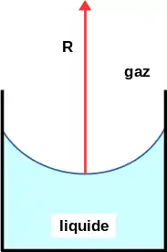 Supposons que l'on ait un liquide en contact avec sa vapeur selon une interface dont la courbure moyenne est . Si on prend le cas où la surface du liquide forme un ménisque concave comme sur le schéma ci-contre, alors ce rayon est négatif. La loi de Laplace-Young indique que la pression dans le gaz et celle dans le liquide sont reliées :