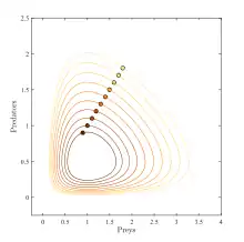 Ce point fixe est donc un foyer et plus particulièrement un centre, ce qui signifie que les populations de proies et prédateurs oscillent autour de leurs valeurs en ce point fixe.