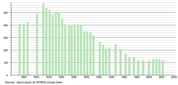 L'évolution du nombre d'habitants est connue à travers les recensements de la population effectués dans la commune depuis 1793. Pour les communes de moins de 10 000 habitants, une enquête de recensement portant sur toute la population est réalisée tous les cinq ans, les populations légales des années intermédiaires étant quant à elles estimées par interpolation ou extrapolation[19]. Pour la commune, le premier recensement exhaustif entrant dans le cadre du nouveau dispositif a été réalisé en 2006[20].