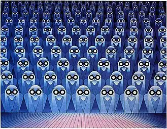 L'œuvre « Le Trac » représente l' « observation réciproque humoristique » d'un vaste public de personnages bleus qui observent une scène de salle de spectacle avec leurs jumelles, observés eux-mêmes depuis la scène.