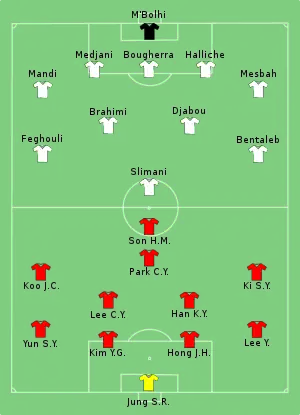 , qui avait besoin d'au moins un point pour rester en vie dans la compétition, a marqué trois buts dans la première moitié de prendre une avance confortable. Tout d'abord, l'Islam Slimani a accéléré deux défenseurs coréens de recevoir longue passe de Carl Medjani et a tiré la maison. Deux minutes plus tard, Rafik Halliche de la tête un corner de Abdelmoumene Djabou. Djabou marqué lui-même plus tard après avoir reçu une passe de Slimani. Au début de la seconde moitié, Son Heung-min contrôlé une longue passe de Ki Sung-Yueng de marquer et de réduire le déficit, mais Yacine Brahimi restauré trois buts l'avance de l'Algérie après un une-deux avec Sofiane Feghouli à la fente maison. Koo Ja-Cheol a marqué le deuxième but de la