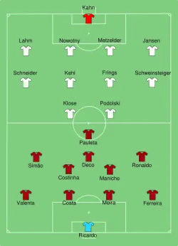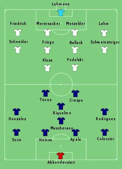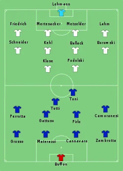 Au coup d'envoi, Alberto Gilardino ouvre le score à la 4e minute, suivi de près par un deuxième but italien marqué par Luca Toni de la Fiorentina trois minutes plus tard. Avec un avantage de 2-0 dès les dix premières minutes, l'équipe allemande se trouve déconcertée par la tactique et la technique du jeu italien. Malgré une légère reprise de l'équipe allemande, le réalisme fait défaut aux hommes de Klinsmann. À la 39e minute, la situation s'aggrave pour l'équipe allemande lorsque Daniele De Rossi marque le but du 3-0. La seconde mi-temps est plus prolifique pour les Allemands, cependant, comme en première mi-temps, ces derniers manquent de réalisme devant Gianluigi Buffon, permettant aux Italiens d'alourdir le score à 4-0 à la 57e minute grâce à un but de Alessandro Del Piero sur un centre de Mauro Camoranesi. Les Allemands sauvent l'honneur à la 82e minute grâce à Robert Huth, marquant ainsi son deuxième but en sélection. Le match se termine sur un score de 4-1 en faveur de l'Italie[36].