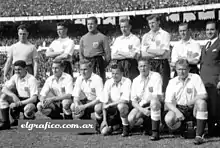 Elle affronte l'Argentine en quart de finale dans un match difficile marqué par la violence et le refus du capitaine argentin de sortir après une expulsion qu'il juge imméritée. L'Angleterre s'impose néanmoins (1-0)[c 15] et accède ainsi aux demi-finales pour la première fois de son histoire : elle s'impose (2-1)[c 15] contre le Portugal. En finale, l'Angleterre d'Alf Ramsey fait la différence contre la RFA (victoire 4-2)[c 16] grâce notamment à un but litigieux marqué durant la prolongation. Trois des quatre buts anglais sont l'œuvre de Geoffrey Hurst, qui signe le seul triplé lors d'un seul match, en finale de Coupe du monde[note 2]. Les joueurs comme le milieu Bobby Charlton, recordman des buteurs en sélection, le défenseur Bobby Moore ou le gardien de but Gordon Banks sont considérés comme les éléments les plus importants du triomphe anglais.