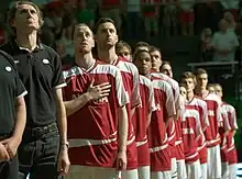 Les joueurs de l'équipe nationale en 2012 lors de l'hymne, avant un match de qualification pour l'Euro 2013 contre la Croatie
