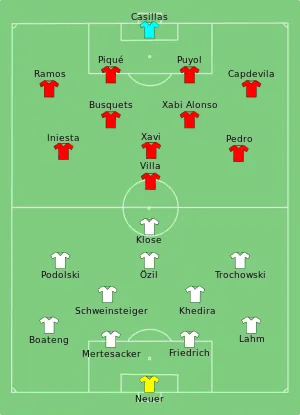 Même affiche que lors de la Finale du championnat d'Europe de football 2008. Et même résultat, qui qualifie l'Espagne pour sa première finale de Coupe du monde.