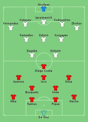 Le , la veille du début de la compétition, le sélectionneur Julen Lopetegui est limogé par la Fédération royale espagnole de football (RFEF) en raison de son engagement avec le Real Madrid[1]. Il est remplacé par Fernando Hierro[2]. Le , Hierro quitte à son tour le poste de sélectionneur après une décevante élimination en huitièmes de finale contre la Russie[3], marquée par un système de jeu espagnol dépassé[4].
