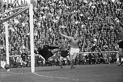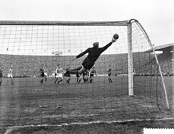 La Belgique commence quinze jours plus tard les éliminatoires pour la Coupe du monde au Chili face à la Suède à Stockholm. Le tirage au sort[20] avait désigné les Scandinaves et la Suisse comme adversaires des Belges dans un groupe où seul le vainqueur était qualifié. La composition de l'équipe belge avait été remaniée en profondeur après le match décevant face aux Pays-Bas et la première mi-temps de bonne facture des Diables Rouges n'avait pas laissé présager d'une défaite (2-0)[21],[22] qui se dessina malheureusement assez rapidement après la pause. Paul Van Himst, futur quadruple soulier d'or et recordman de sélections et de buts, était à l'occasion sélectionné pour la première fois et devient le plus jeune international, âgé d'à peine 17 ans et 17 jours. Il allait devenir l'une des figures du football belge en particulier, et du sport belge en général au même titre qu'Eddy Merckx et Jacky Ickx.