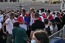En , l'équipe de France participe à un Championnat d'Europe pour la 30e fois à l'occasion de la 32e édition se déroulant dans quatre pays (Estonie, Finlande, Pologne et Tchéquie). Les Bleus disputent leur premier tour à Tallinn en Estonie. Le , ils le concluent par une cinquième victoire en autant de rencontres disputées, où seule l'Allemagne est parvenue à leur prendre un set, avant de se diriger vers la Tchéquie pour le début de la phase finale[15]. En huitièmes de finale, après huit balles de match sauvées, les Français s'inclinent 0-3 (22-25, 19-25, 32-34) face à l'équipe tchèque qui évolue à domicile à Ostrava. Usés, les champions olympiques et médaillés de bronze de la Ligue des nations ne peuvent monter sur un troisième podium en un été, en conséquence d'une longue campagne internationale (31 matchs officiels et deux amicaux depuis mai). Comme lors de l'Euro 2017, les Bleus sont éliminés en huitième de finale par cette même équipe[16].
