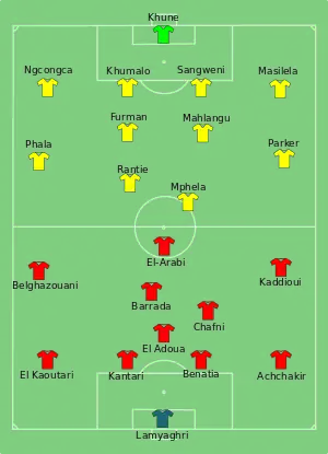 À la 9e minute, sur un corner d'Abdelaziz Barrada, Issam El Adoua a ouvert le score par un but de la tête. Après avoir dominé la première période, les Lions de l'Atlas se sont éteints au retour des vestiaires, dans la seconde période, les Marocains ont raté plusieurs occasions, notamment celles de Chafni (20e, 45e), Barrada (48e) ou encore El-Arabi (60e). May Mahlangu en a profité pour égalise sur un magnifique tir à la 70e minute, ensuite vers la fin de la rencontre, le jeune rajaoui Abdelilah Hafidi mène pour la deuxième fois les marocains au score (82e min), quatre minute après, sur un tir à l'entrée de la surface Siyabonga Sangweni égalise le score pour les Bafana Bafana. Les Marocains sont éliminés de la CAN sans perdre le moindre match [13],[14]!