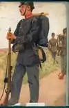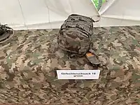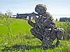 Tenue de combat actuellement en vigueur (grenadier). Le casque et la tenue de base sont identiques pour la plupart des troupes de l'Armée suisse. Ici équipé du Mzgw 91.