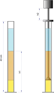 Après repos, la hauteur h1 du niveau supérieur du floculat par rapport au fond de l'éprouvette graduée est mesurée. Le piston est ensuite abaissé dans l'éprouvette jusqu'à ce que l'embase repose sur le sédiment, ce qui permet de mesurer la hauteur h2, distance entre la face inférieure de la tête du piston et la face supérieure du manchon[8].