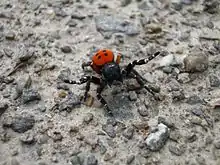 Le céphalothorax du mâle, légèrement surélevé, est noir avec quelques soies blanches. L'abdomen est couvert de soies rouge orangé avec deux ou trois paires de taches noires dorsales, parfois cerclées de blanc. Les pattes sont noires avec des anneaux blancs aux articulations. Les pattes III et IV portent des soies rouges.