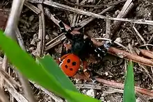 Le mâle se reconnaît aisément grâce à son abdomen rouge vif orné de quatre taches rondes et noires[3]. La femelle de cette araignée fouisseuse est presque entièrement noire, à l'exception d'un semis de poils ocrés sur la tête[3].