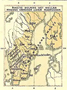 À la tête des Suédois révoltés contre son père, il envahit le Halland et prend la forteresse de Varberg à Bengt Algotsson le favori de son père. Par le traité de Jönköping le , il obtient avec le titre royal le Halland méridional, la Scanie, le Blekinge, l'Östergötland la plus grande partie du Småland, Visingsö et la Finlande.