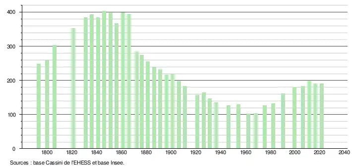 L'évolution du nombre d'habitants est connue à travers les recensements de la population effectués dans la commune depuis 1793. Pour les communes de moins de 10 000 habitants, une enquête de recensement portant sur toute la population est réalisée tous les cinq ans, les populations légales des années intermédiaires étant quant à elles estimées par interpolation ou extrapolation[21]. Pour la commune, le premier recensement exhaustif entrant dans le cadre du nouveau dispositif a été réalisé en 2006[22].