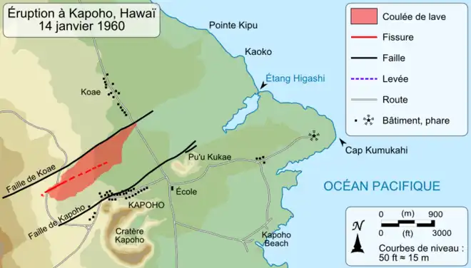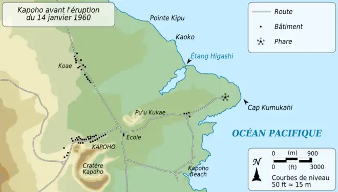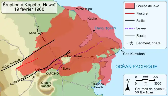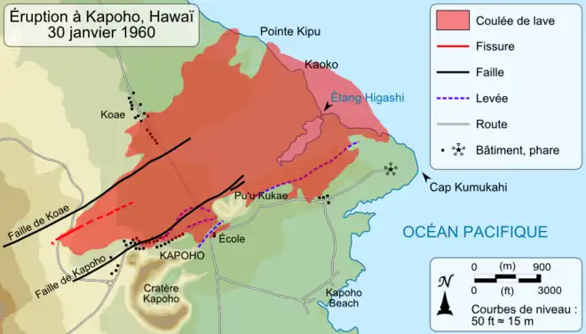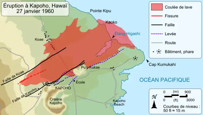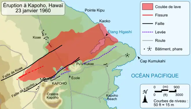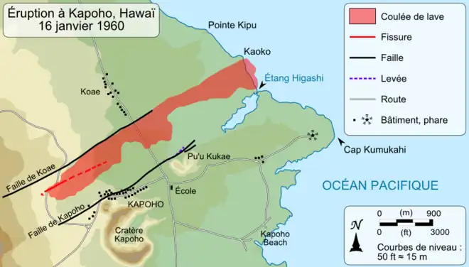 Une localité de 300 habitants, une école, des églises, des routes, des cultures ont été détruites et recouvertes par plusieurs mètres d'une lave qui s'est avancée en mer, modifiant le trait de côte en amenant notamment le cap Kumukahi, point le plus oriental d'Hawaï, un peu plus vers l'est[17]. Après le refroidissement de la lave, Kapoho n'est pas reconstruite, à l'exception de quelques bâtiments au sud-ouest de l'emplacement de l'ancienne localité, à côté de la coulée de lave[20]. Les routes sont retracées, la côtière traversant la coulée de lave de part en part et celle menant au phare du cap Kumukahi via Kapoho reprenant l'ancien itinéraire[20]. Une partie de la coulée de lave, notamment la masse de téphras formée le 27 janvier, est depuis exploitée comme carrière de scories non loin de Koaʻe[20].