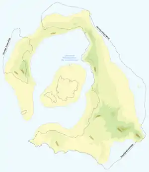 Image satellite de l'archipel de Santorin aujourd'hui : la caldeira est formée de l'île principale de Santorin, de l'île de Thirassía et de l'île minuscule d'Aspronissi au sud-ouest. Au milieu se trouvent deux îles postérieures à l'éruption : Paléa Kaméni et Néa Kaméni. | ||