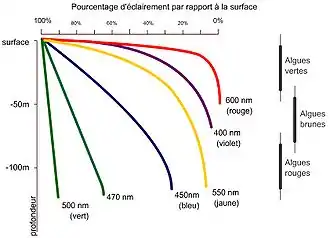 où z est la profondeur, Iλ l'intensité à une longueur d'onde lambda et kλ le coefficient d'absorption à cette même longueur d'onde. Ce coefficient k est donc variable selon la longueur d'onde étudiée, ce qui fait que toutes les longueurs d'onde ne sont pas absorbées de la même manière par l'eau. Les longueurs d'onde correspondant à la couleur rouge sont les premières à être absorbées par l'eau et par conséquent à devenir indisponibles pour les végétaux. De la même manière, les longueurs d'onde correspondant aux couleurs bleues sont absorbées en dernier lieu.