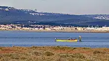 Flamants roses sur l'étang, au fond Gruissan. | ||||