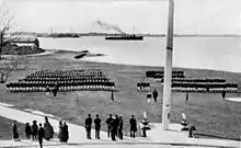 En septembre, des travaux d'aménagement commencent à Pontanézen, près de Brest, pour la construction d'une véritable ville qui va accueillir 70 000 militaires américains en transit avant de monter au front. Pour chaque homme qui débarque, une tonne de matériel arrive également en France. Brest va ainsi devenir le principal port de débarquement (et de réembarquement) des soldats américains et le quartier général de l'US Navy en Europe[31]. Ainsi le SS Léviathan, alors plus grand bateau à vapeur au monde, desservait uniquement le port breton et sur les 2 millions de membres de l'AEF, plus de 700 000 arrivèrent par Brest[32] (c'est également via Brest que le président des États-Unis, Woodrow Wilson, arriva en Europe en 1919). Un monument, le Naval Monument de Brest construit dans les années 1930 le rappelle.