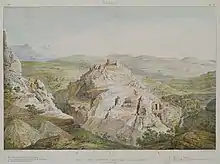 Vue d'une partie de la ville de Lebadée, lithographie d'Étienne Rey d'après un dessin d'un certain Nat.