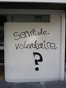 Si La Boétie est toujours resté, par ses fonctions, serviteur fidèle de l’ordre public, il est cependant considéré par beaucoup comme un précurseur intellectuel de l’anarchisme[14] et de la désobéissance civile. Également, et surtout, comme l’un des tout premiers théoriciens de l’aliénation.