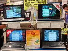 L'étiquette numérique pour ordinateurs portables est liée à une base de données des caractéristiques de produits qui alimente des étiquettes dynamiques sur les écrans via Wi-Fi, le tout géré par une interface web, soit en point de vente, soit au siège du réseau de distribution, soit les deux (au point de vente de gérer le contenu diffusé en fond d'écran et la centrale d'achat de choisir le prix, par exemple)[réf. nécessaire].