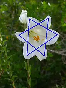 Le spécialiste des symboles hébreux et juifs, Uri Ophir[20], pense que l'origine de l'étoile de David est associée à la Menorah du Temple de Jérusalem. Sous chacun de ses sept chandeliers se trouvait une fleur (Ex. 25:31) qui pouvait être un lys blanc dont la forme ressemble à l'étoile de David. Les pétales du lys blanc, comme le montre Uri Ophir, sont disposés symétriquement et, lorsqu'ils sont ouverts, forment une étoile régulière à six branches, maintenant connue sous le nom d'étoile de David. Ainsi, chaque bougie de la Menorah était au centre d'un Magen David.