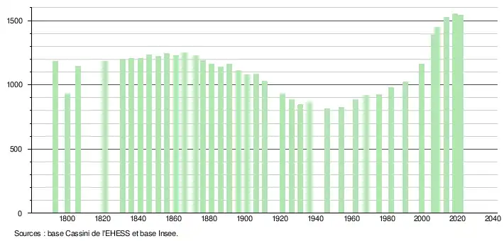 L'évolution du nombre d'habitants est connue à travers les recensements de la population effectués dans la commune depuis 1793. Pour les communes de moins de 10 000 habitants, une enquête de recensement portant sur toute la population est réalisée tous les cinq ans, les populations légales des années intermédiaires étant quant à elles estimées par interpolation ou extrapolation[20]. Pour la commune, le premier recensement exhaustif entrant dans le cadre du nouveau dispositif a été réalisé en 2008[21].