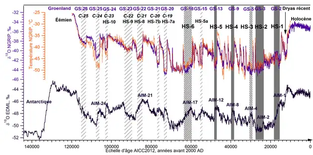 Enfin, une troisième méthode consiste à identifier l'empreinte climatique des événements de Heinrich dans des archives présentant des chronologies précises, comme les carottes de glace[28],[29], ou encore les spéléothèmes des grottes, qui présentent souvent les incertitudes de datation les plus faibles[30]. L'inconvénient de cette méthode est que l'on ne peut habituellement pas vérifier si la débâcle d'iceberg enregistrée par les IRD dans les carottes marines était synchrone ou pas avec l'anomalie climatique enregistrée dans d'autres archives.