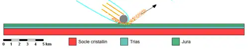 D'après le géologue Erwin Rutte, les traces de cet impact ne se limitent pas à la région alentour du cratère du Ries. Il affirme que l’impact de centaines de millions de corps solides de différentes tailles majoritairement composés de roche et de fer, de poussière, de gaz et de glace, qui a également laissé des traces dans une zone du Jura située à côté des cratères, s’étend du Jura à la Bohême en passant par le district du Haut-Palatinat, le district de Basse-Bavière et le land de Haute-Autriche[15],[20].
